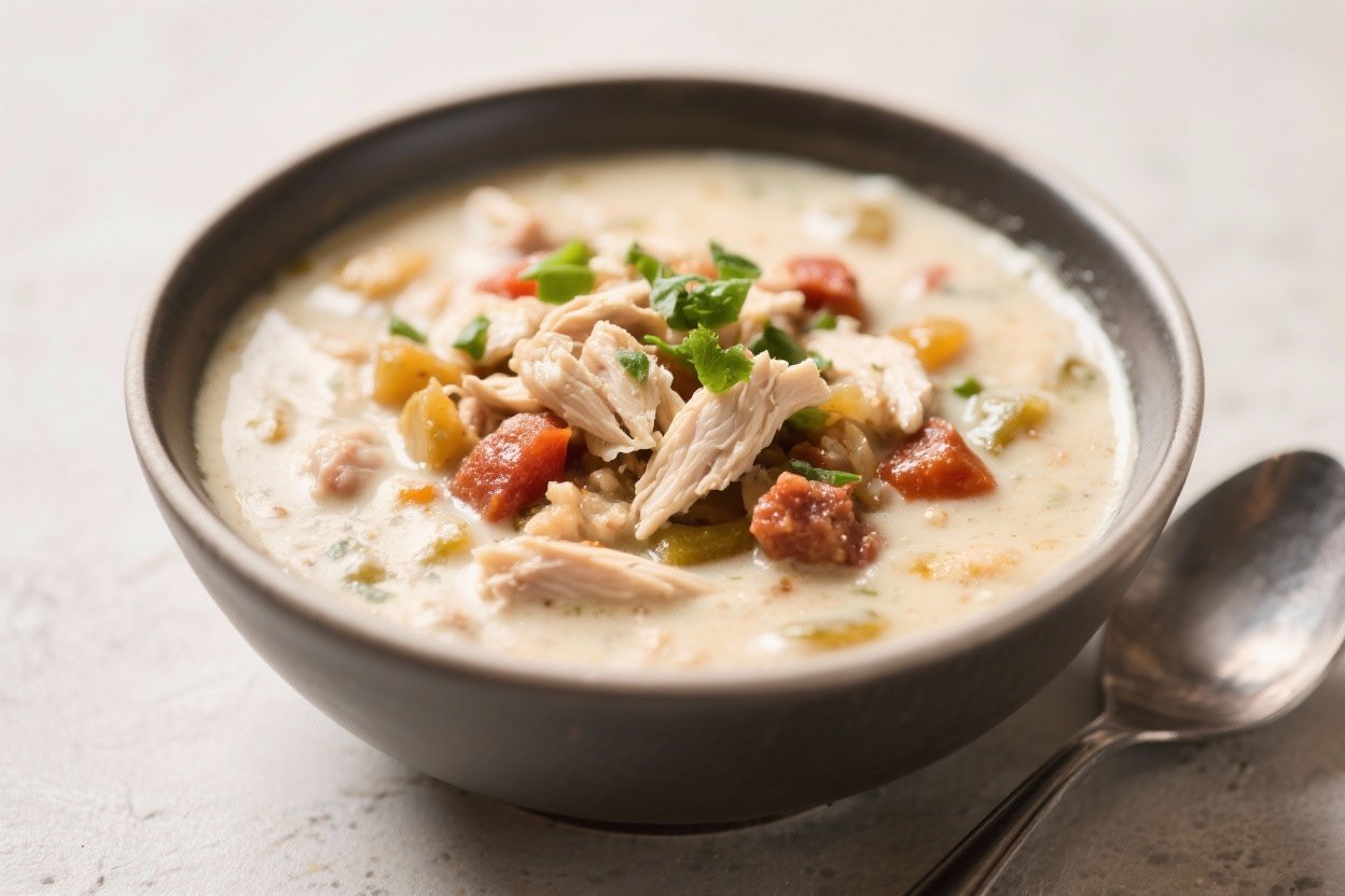 A base of sautéed onion, garlic, and spices builds warmth, while green chiles add gentle heat without overpowering the dish. The creaminess comes from a mix of broth, a touch of cream cheese, and a splash of half-and-half—or Greek yogurt for a lighter twist. Finished with a squeeze of lime and fresh cilantro, it hits all the right notes: creamy, zesty, and comforting.